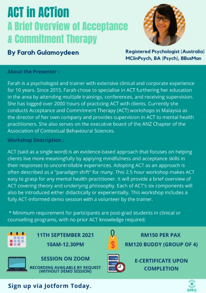 An overview of ACT suitable for any mental health professional including post-graduate students. This workshop covers theory and the underlying philosophy of ACT. The components of ACT will be introduced didactically, experientially and through a demo session. Delivered via Zoom with recording available upon request.