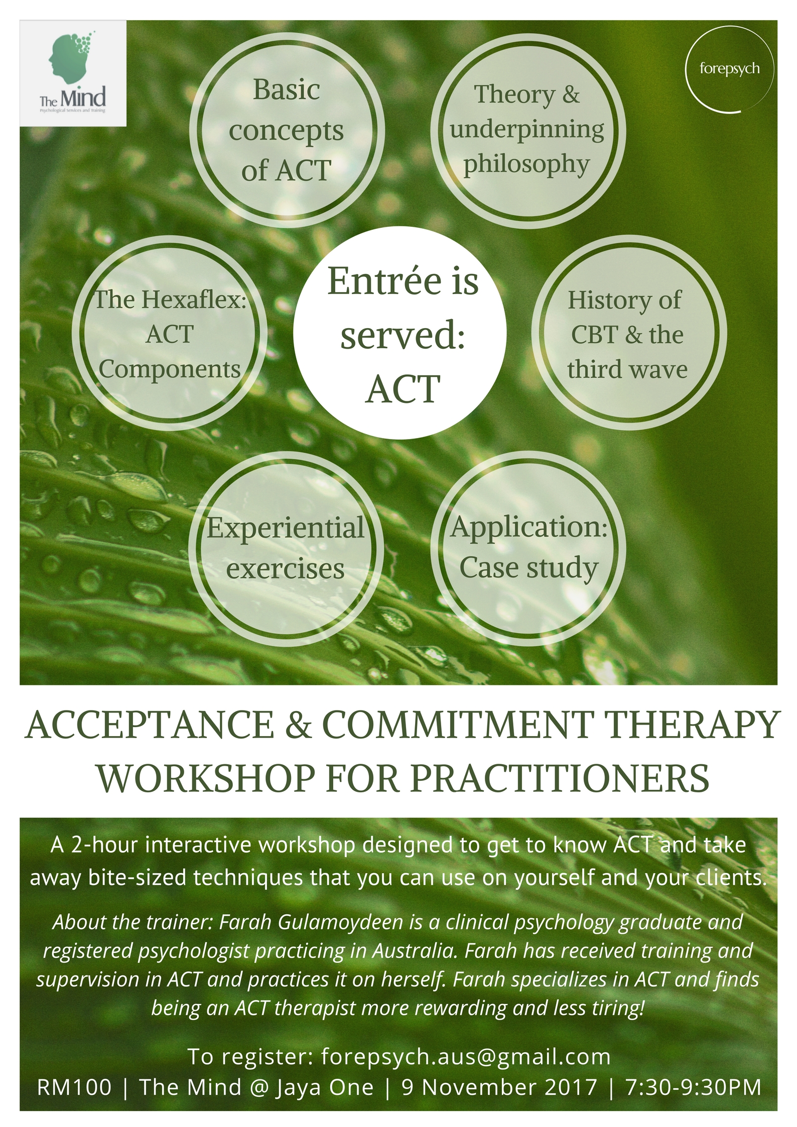 It is called Entree is Served as it is meant to be a taster of ACT, especially for those who are new to ACT and not sure if this is an approach they would want to go further with. It is designed such that even if you do like ACT after attending this workshop, you would be equipped to learn ACT on your own through self-study. Being an ACT therapist does not require certification.