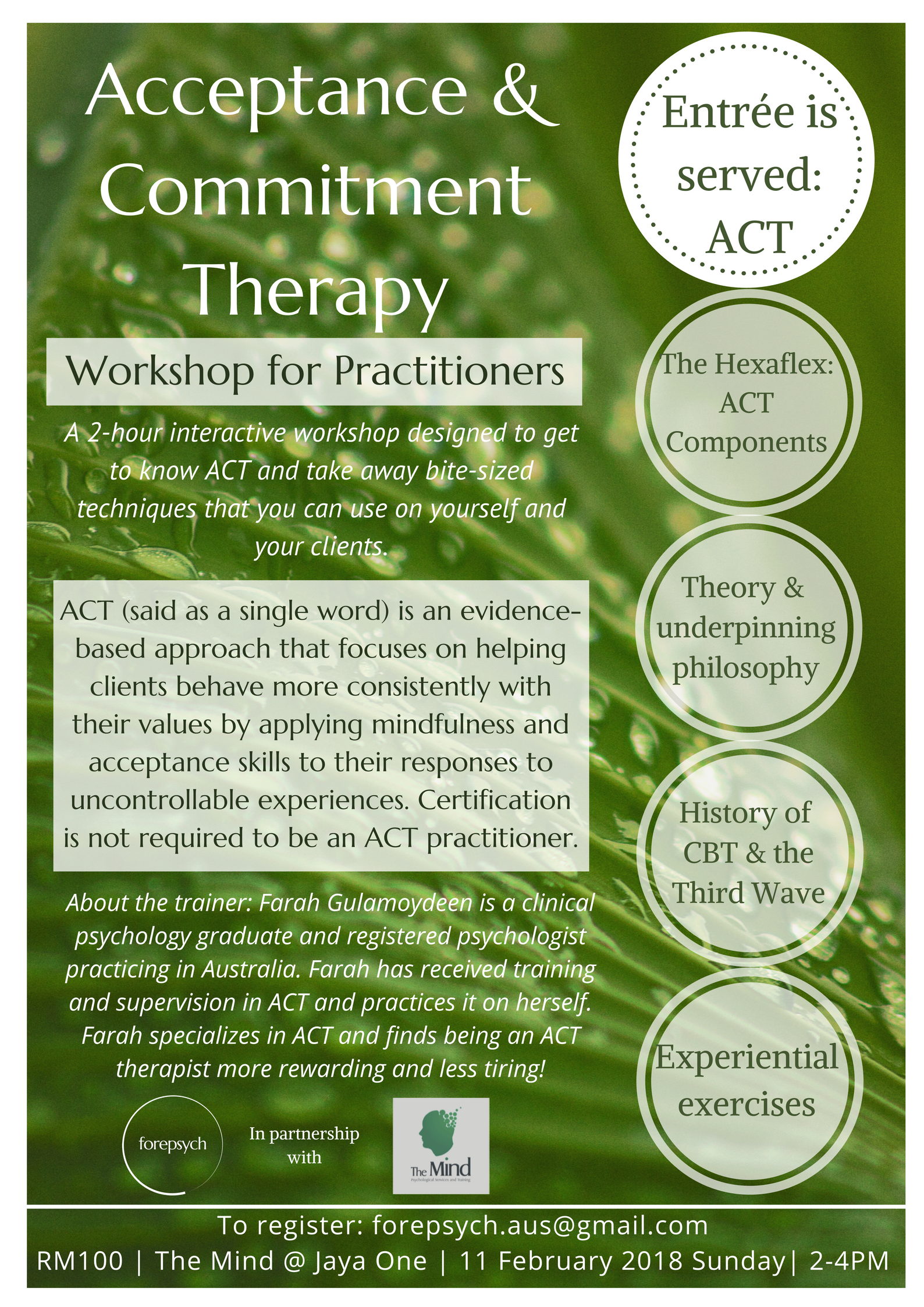 It is called Entree is Served as it is meant to be a taster of ACT, especially for those who are new to ACT and not sure if this is an approach they would want to go further with. It is designed such that even if you do like ACT after attending this workshop, you would be equipped to learn ACT on your own through self-study. Being an ACT therapist does not require certification.
